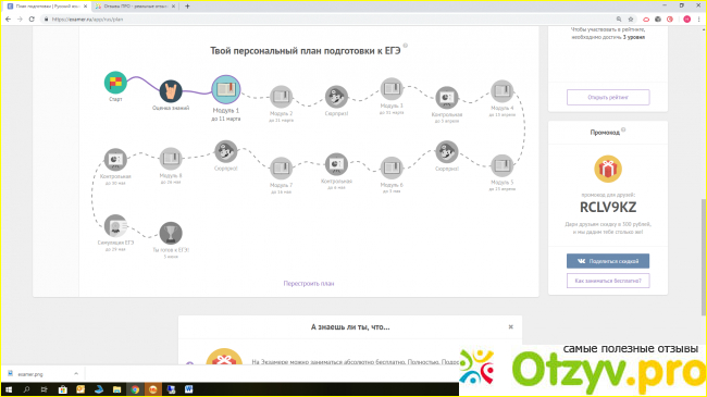 План подготовки разбит на проверочные работы и модули, которые включают в себя, так называемые, квесты (в случае проверочных работ – это уже пройденные темы). Проходя навигацию по обучению, все время нажимайте «Далее» или займитесь прохождением квестов и установите сроки, в которые планируете то или иное задание. Проходя квесты, вы получаете очки опыта, благодаря такой системе, можно проще отслеживать свой прогресс.