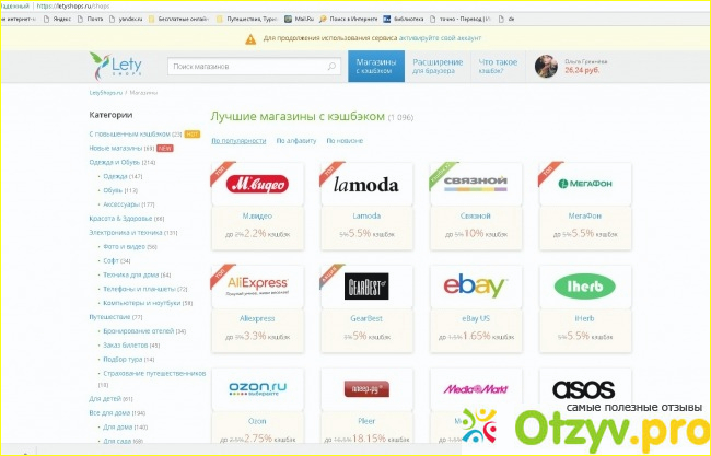 Что нужно для того, чтобы получить дополнительную денежку в свой личный кабинет на сайте кэшбэк-сервиса "letyshops" (Летишопс)? Прежде всего, согласно инструкции: зарегистрироваться на сайте или зайти с помощью одной из социальных сетей таких как, в контакте или фейсбук и др. Далее нужно выбрать интернет-магазин, там где Вы хотите сделать вашу покупку, слева, либо по названию поиск магазинов и найти. Далее нажимаете на магазин и зелёным будет написано перейти в магазин и название магазина (внизу будут написаны условия, когда будет начислен кэшбэк. минимальная сумма заказа, если есть, а вверху сумма кэшбэка). Теперь нажимаете, появляется отсчёт и надпись кэшбэк активирован и переход в интернет-магазин, вот и всё, ничего сложного. Советую, прежде, чем заходить на кэшбэк сервис "letyshops" (Летишопс), заранее зайти в интернет-магазин, где Вы будите делать покупки и быть уже там зарегистрированным, а лучше зайти под своим логином и паролем. Далее зайти на "letyshops" (Летишопс) и уже переход именно с сайта "letyshops" иначе кэшбэк начислен не будет. Кэшбэк начисляется автоматически, вся информация о начислениях приходит на вашу электронную почту и можно посмотреть в личном кабинете. Вывод средств с сайта "letyshops" можно на любой кошелёк: Вебмани, Яндекс-Деньги, Киви, PayPal, а также пополнение мобильного телефона, а также банковские карты: Виза и МастерКард (Россия и Украина). Но минимальная сумма для вывода денег должна достигнуть 500 рублей. Я уже выводила 3 раза и сумма была более 1 700 рублей. Деньги приходили на банковскую карточку в течение 3-5 дней. Комиссия банка отсутствует. Можно также приглашать друзей и получать 15% от каждого их кэшбэка, действует реферальная ссылка можно просто скопировать её, а можно поделиться с друзьями в социальных сетях, друзья должны пройти только по ней и тогда Вам будет начисления 15% с их каждых покупок. Также новичкам, тем кто первый раз вывел 500 рублей "letyshops" за написанный и опубликованный отзыв об их сервисе-кэшбэка дарит 100 рублей. Кэшбэк-сервис "letyshops" подходит тем людям, кто делает покупки в интернет-магазинах. И хотелось бы, чтобы добавили интернет-магазины: Wildberries и Эльдорадо.