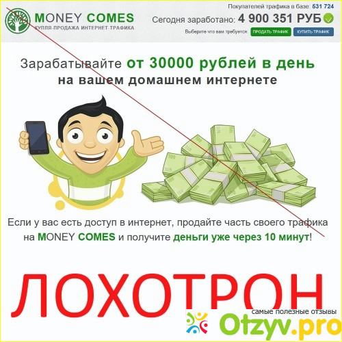 Потом для личного убеждения посмотрел одно очень интересное видео на Ютубе, где одна девушка говорит о том, что это уже не первый подобный проект от одного и того же владельца. И вот вам самый главный ответ на сегодняшнюю тему: проект Money Comes - это самый настоящий мошенник, который высасывает деньги со своих пользователей, вас безусловно они к себе заманивают довольно удобным интерфейсом и сразу же предлагают вам заработать за считанные минуты хорошие деньги. И первый же заголовок на сайте о том, как заработать от 30 000 рублей в сутки, при этом ничего не делая. Сначала вам льют по ушам, что дело это весьма существенное и вам необходимо всего лишь проверить качество вашего траффика, вы лишь заполняете небольшую форму на главной странице, указываете логин, после чего нажимаете на кнопку оценка качества траффика и вам выдает количество пользователей, которые готовы у вас купить траффик, после чего вы нажимаете еще одну кнопку и даете согласие на продажу, и вот в течении минуты вам будут капать солидные деньги на ваш баланс. И при этом будут открываться в виде всплывающих табличек надписи, кто сколько из пользователей заработал денег. Ну и финальный аккорд, для того, чтобы вывести деньги из системы, вам необходимо будет оплатить 0,2% от вашего заработка - 75 рублей. Вы их оплачиваете и продолжаете якобы зарабатывать деньги в интернете, но как только вы начнете выводить деньги, вам напишут, что перевод денег приостановлен без указания причины.