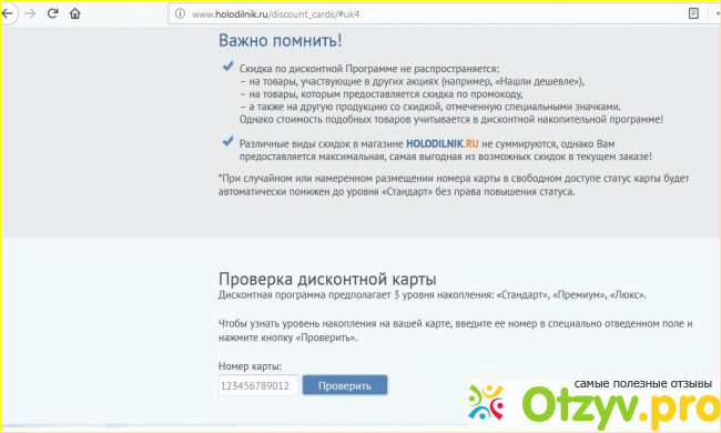 Но есть некоторые ограничения, я встречала негативные отзывы о "Холодильник. ру" только потому, что люди думали, что по их карте, а чаще всего карте, которую они брали у друзей, должна распространяться скидка на товар по акции. Честно говоря такое бывает редко, когда уже и так на товар по низкой цене действует еще одна скидка. Так что у интернет-магазина вполне адекватные условия в рамках которых скидка по карте не действует на акционный товар, на товары по которым вы получили снижение цены, используя промокод. Плюс ко всему, если продукция отмечена специальным ценником, скидка по карте тоже не пройдет. Тут Америка не открыта, так почти во всех магазинах.