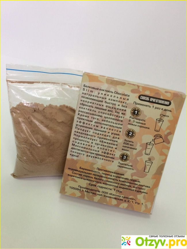 Внутри пакетика находится порошок светло-коричневого цвета. У порошка достаточно приятный запах какао. И это не случайно, ведь данный компонент присутствует в этой добавке. На коробочке от средства можно узнать основные проблемы, которые решает порошок. А вот с обратной стороны на упаковке есть еще небольшое описание по поводу этого средства, а также правила его использования.