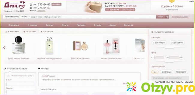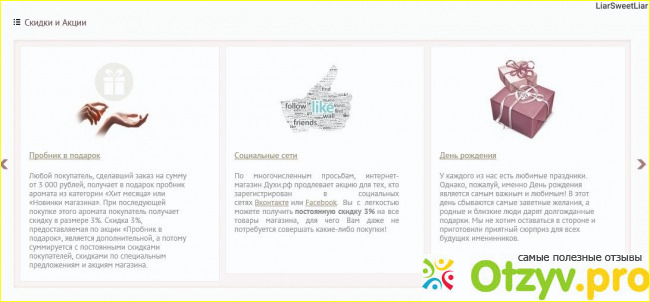 Мне сайт понравился тем, что на нем простая и удобная навигация, очень большой ассортимент товара, много скидок, приемлемые цены, подарки. Можно заказывать пробники, флаконы, тестеры, полноценные флаконы с ароматами. Большой выбор продукции с расспродажей ( на товары в категории расспродажа нет скидок). не могу не отметить, вежливых менеджерей. ну а качество - просто супер! Я и думать не думала, что выберу просто по названию аромат, в который просто влюбилась!!