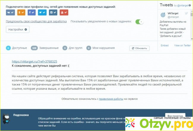 После этого можно уже приступать к выполнению заданий. Заданий там, как правило не очень много в день приходит: это твиттнуть какой-нибудь пост, лайкнуть, подписаться на какую-нибудь группу Вконтакте, сделать репост, просмотреть видео на Ютубе и т. д.