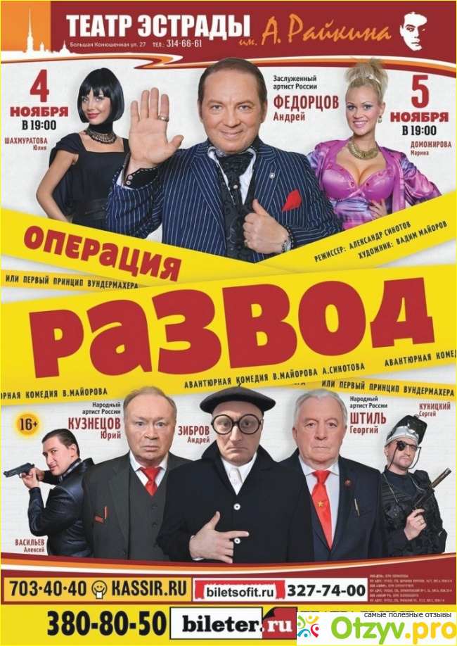 где в настоящее время располагается театр эстрады. История театра , как уже и было сказано, очень богатая, на этом мы сейчас останавливаться не будем. Название театра , как вы понимаете (Имени Аркадия Райкина, идет от того, что этот великий человек многие годы творил здесь), и по настоящее время его гримерка находится там , где и была, как напоминание о том, что театр -это не просто так, а дело весьма серьезное. В настоящее время художественным руководителем театра является Юрий Гальцев, тоже, как я считаю, человек талантливый и порядочный. Актеры театра -один к одному. Поэтому спектакли , которые здесь показывают зрителям, просто не могут быть плохими. Находится театр эстрады имени Аркадия Райкина в городе Санкт-Петербурге, на улице Большой Конюшенной , дом номер двадцать семь. На всякий случай телефон контакта: восемь восемьсот двенадцать триста четырнадцать шестьдесят шесть шестьдесят один. Но билеты лучше заказывать на сайте. На сцене театра выходит спектакль "Операция развод".