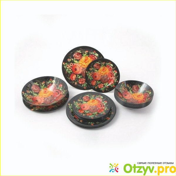 Очень яркая и праздничная посуда, которая отличается своим смелым и стильным дизайном, выполненным в стиле гжель, жостовская роспись. В наборе тарелки плоские под вторые блюда и глубокие для супа. Также имеются и чайные, кофейные сервизы. Преимущество таких наборов кроется в том, что изготовлены из специального закаленного стекла, которое не бьется и хорошо отмывается даже в воде при низкой температуре.