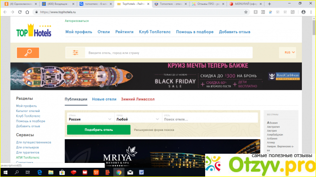 Что же мы видим? А видим мы, что сайт предлагает нам не только про гостиницы почитать, но также написать свой отзыв (для этого необходимо зарегистрироваться на ресурсе), подобрать тур, прочитать интересные статьи про путешествия (часто они пишутся в виде разнообразных рейтингов и топов, к примеру, сейчас на сайте можно ознакомиться со статьей, рассказывающей о лучших десяти отелях Турции с подогреваемыми бассейнами, которые прекрасно подойдут для зимнего отдыха").