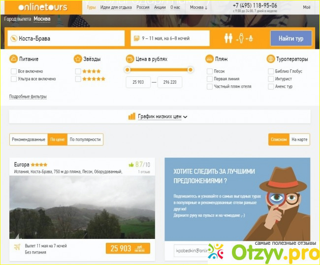 Кстати сайт onlinetours.ru очень удобный, вы сразу же можете воспользоваться строкой поиска туров, указать количество дней или ночей, выбрать соответствующую страну и город, указать количество отдыхающий и система подберет вам различные варианты, вы можете сравниться с ценами, почитать подробное описание отелей, все это сопровождается фотоматериалами, также почитать и отзывы на сайте.