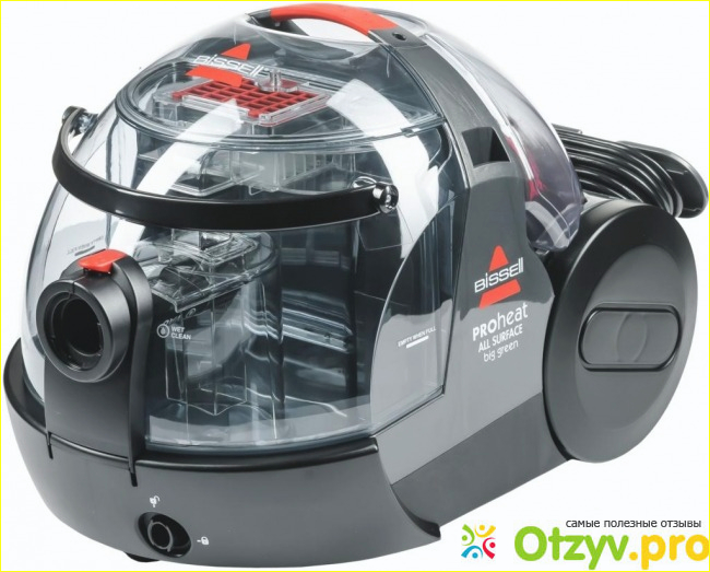 Работает пылесос не так шумно и длины шнура мне вполне хватает, чтобы убраться в двух комнатах, предусмотрено автоматическое сматывания шнура. Еще хотелось бы отметить, что сам пылесос довольно удобно обслуживается, достаточно лишь вытащить пылесборник и промыть его под водой, также стоит промывать и оставшиеся фильтры. Еще одной уникальной особенностью данного пылесоса является то, что в нем встроен нагреватель для моющего раствора до 14 градусов, необходимо это для более надежной и качественной мойки ковровых покрытий.