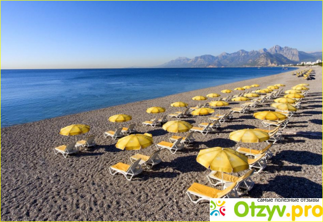 На пляже полно зонтиков и шезлонгов. Везде чисто, и в море, и на берегу.