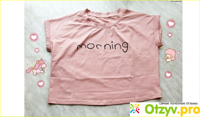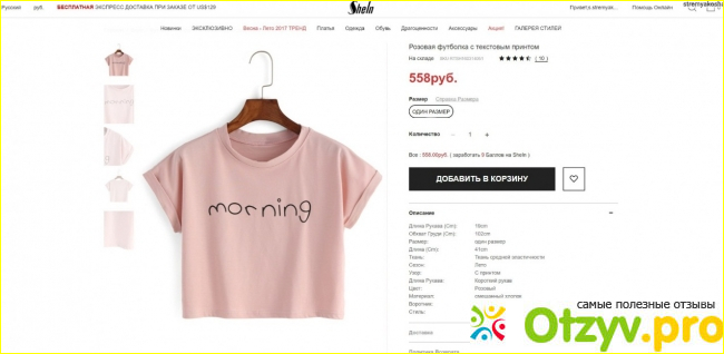 Заказывала я себе простую розовую футболку с принтом «morning». Ее стоимость составила пятьсот пятьдесят восемь рублей. Мне понравилось, что на страничке можно найти всю необходимую информацию о любой вещи на сайте: ее описание, размеры, даже отзывы! Это радует больше всего! А еще есть возможность выставлять оценки вещи — у моей футболки оценка на сайте четыре с половиной балла.