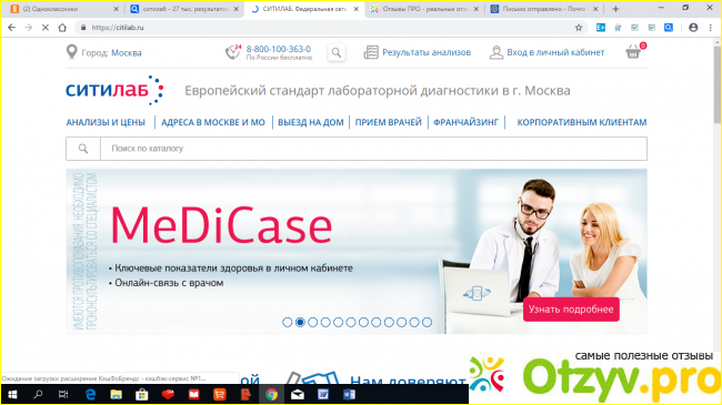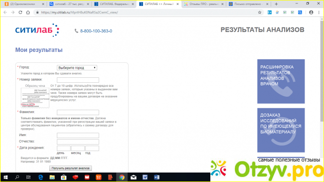 Во-первых, на сайте можно проследить, что происходит с вашими анализами и получить результаты. Для этого надо кликнуть на вкладку "Результаты анализов", она расположена в верхней строке сразу за номером горячей линии. Есть еще возможность заказать расшифровку результата, что освобождает от необходимости идти к доктору.