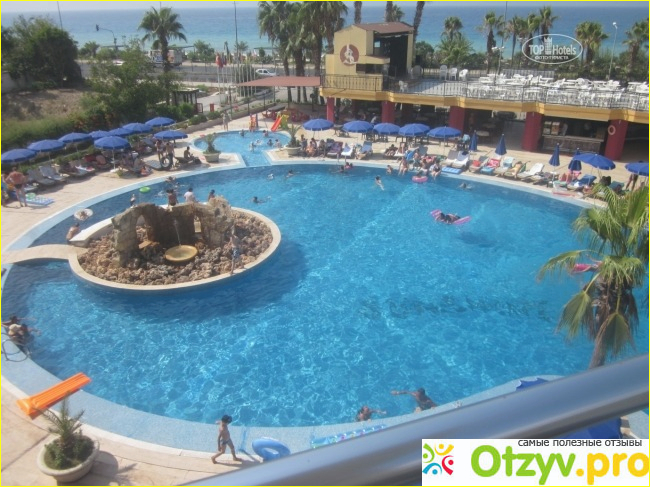 Бассейнов при отеле два: детский с горками и взрослый. Нам очень понравился взрослый бассейн, он просторный и довольно глубокий - достигал 2,5 м. Вокруг бассейна располагались лежаки, их довольно много, но на всех не хватало. Многие постояльцы просто занимали их, а сами гуляли где-то, тем самым не давали другим нормально отдохнуть.