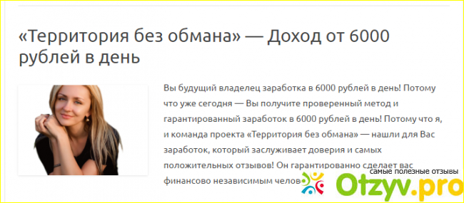 Этот сайт предлагает заработать деньги, но в это верить не стоит, не стоит даже пробовать пытаться слушать то, что пишут о нем люди. Это все пытается вас заманить на то, чтобы в попались на очередную уловку мошенников. Я обратил внимание на то, что я читал отзывы на сайте и там, якобы, отзыв написан от знаменитой актрисы сериала "Кадетство" Линды Табагари, фотографию которой просто вставили, которая является обложкой сайта "Территория без обмана", которая просто не стала такого писать, напросился вывод о том, что просто писали создатели сайта такие отзывы и просто хотели привлечь нас своими обещаниями, чтобы мы выбрасывали деньги на ветер, а их тем самым кормили.