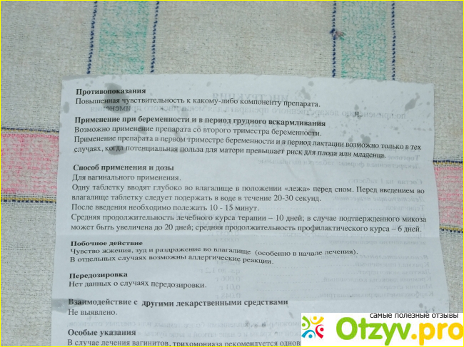 Также существуют побочные действия на организм :Особенно в начале лечения испытывала зуд, чувство жжения и раздражение во влагалище . Желтые выделения в большом количества, вызванные выходом остатками таблеток. В следствии чего происходит дискомфорт в течении дня.