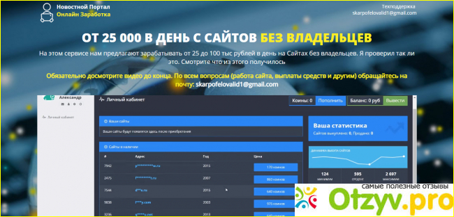 Специфика заработка этого сайта заключается в том, что зарегистрированным пользователям предлагаются сайт без владельцев, которые они приобретают по выгодной и минимальной цене, а потом могут продать их по хорошей стоимости. Уже сама эта идея должна насторожить пользователей.