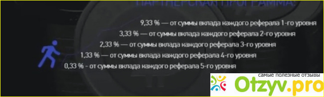 Кроме того в этом проекте предлагается партнерская программа с помощью которой можно не только зарабатывать на процентах от инвестиций, но и получать деньги от своих рефералов, то есть от участников программы, которых вы пригласили. Реферальная программа имеет пять уровней. От рефералов первого уровня начисляется 9,33 % от суммы вклада реферала. От рефералов второго уровня начисляется 3,33%, третьего уровня 2,33%, четвертого 1,33% и пятого уровня 0,33%.