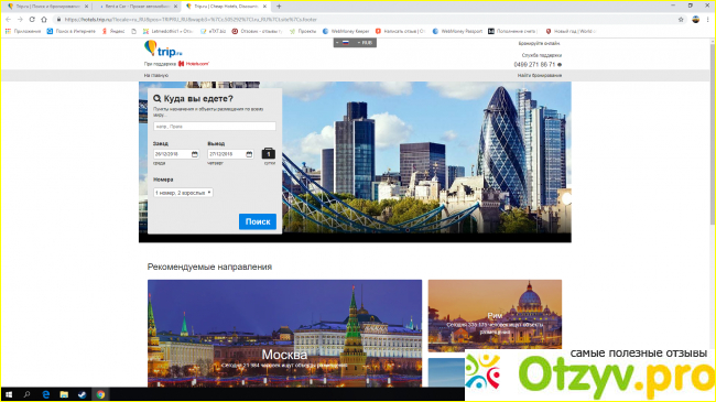 Как видите, тут дизайн очень похож на главную страницу. Вы выбираете куда направляетесь, время заезда в отель и уезда из него, время пребывания по дням, а также вариант номера, сколько всего номеров вам нужно, сколько человек в одном номере, есть ли взрослые есть ли дети и другое. Потом, вам будут подобраны все существующие отели, подходящие под ваш запрос, а ваше дело уже сравнивать цены, смотреть на число звезд у отеля и другие показатели. Ниже вам будут предложены самые популярные и рекомендованные города по всему миру. Здесь также работает техподдержка.