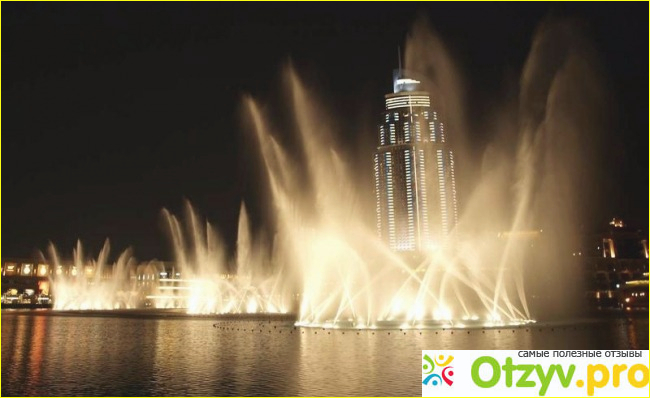 Рядом с Бурдж Халифа, расположено озеро с цветной подсветкой, и с поющим фонтаном. В вечернее время запланировано два представления. Первое - в 18:00. В это время играет музыка, и множество переливающихся струй разбегаются то в одну, то в другую стороны. Создаётся впечатление, что струи воды танцуют. Высота достигает 200 метров. Красивое зрелище которое навсегда остаётся в памяти.