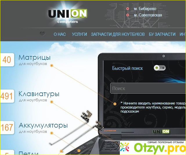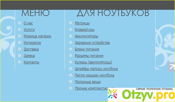 В третьем пункте меню можно ознакомиться с техникой, которую здесь можно приобрести (ЗАПЧАСТИ ДЛЯ НОУТБУКОВ). Здесь имеются такие варианты: