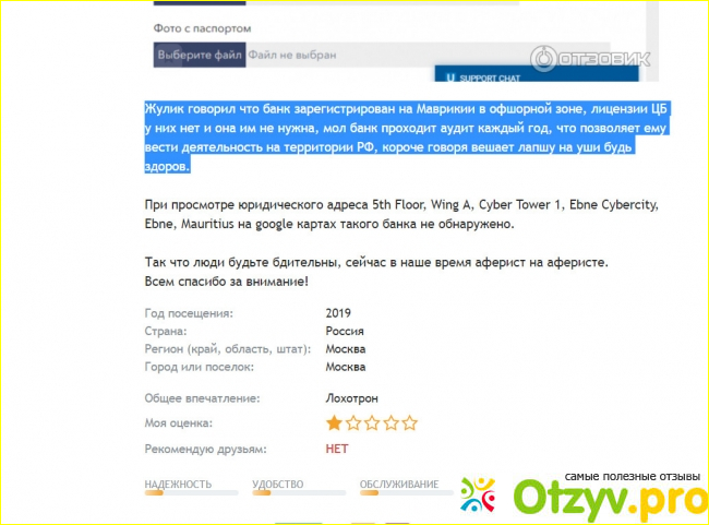 Про United btc bank писали в "Отзовике", где вряд ли будут публиковать купленные рецензии на проекты. Один из авторов возмущался их требованиям, а так же говорил об неуязвимости в случае обмана: "Жулик говорил что банк зарегистрирован на Маврикии в офшорной зоне, лицензии ЦБ у них нет и она им не нужна, мол банк проходит аудит каждый год, что позволяет ему вести деятельность на территории РФ, короче говоря вешает лапшу на уши будь здоров".