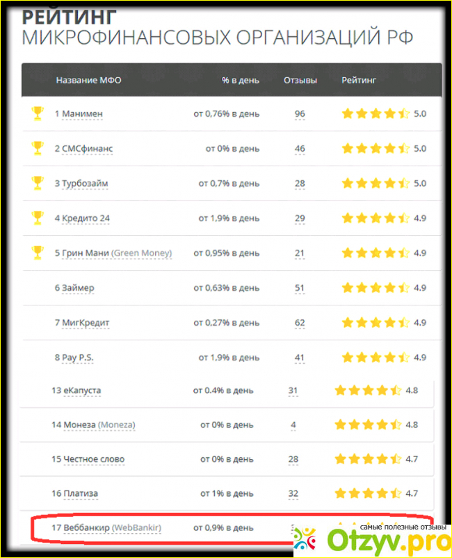 Микрофинансовых организаций сейчас очень много. Одной из таких и является "webbankir". Среди заемщиков данная компания пользуется стабильной средней популярностью. Кто то пользуется только ее услугами, кто-то решил отдать предпочтение конкурентам. Процент одобрения заявок на микрозаймы оставляет желать лучшего. Для его получения необходимо соответствовать определенным требованиям компании, но и это не дает гарантии. Если рассматривать независимый рейтинг организаций, выдающих займы населению, то "webbankir", хоть и не на последнем месте, но тем не менее в десятку лучших так и не вошел.