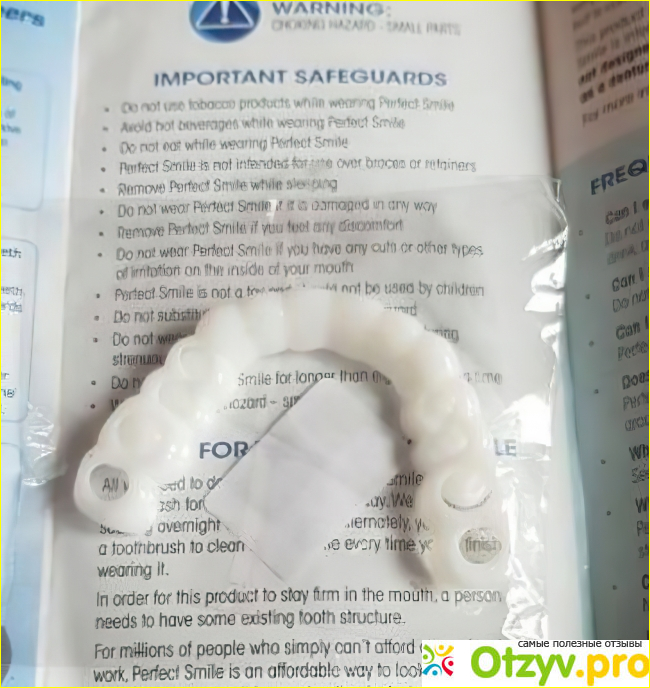 Если долго носить, то начинаешь привыкать, хотя полностью ощущение чужеродности во рту не проходит. Прекрасный вариант, чтобы по улыбаться гостям или сделать замечательные снимки с белоснежной улыбкой. Пить они не мешают, а вот кушать с ними не комфортно. Тем более твердую пищу пластиком есть как-то не очень. Главное не пытаться с ними кушать горячий суп или пить горячие напитки, вроде чая или кофе. Тогда они попросту могут размягчиться и отлететь от зубов, а выглядеть это будет за столом не этично. В целом для внешнего вида пойдёт, хотя качество могло бы быть и получше. Так что бренд хоть и американский, но подделок под него огромное количество. Теперь и я неуверенная, может быть приобрела подделку, только очень качественную.