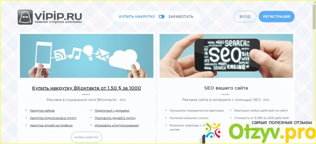 Сайт vipip.ru предоставляет услуги по покупке активной рекламы. Здесь можно заказать накрутку в контакте, SEO вашего сайта, рекламу в социальных сетях, рекламную рассылку и многое другое.
