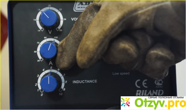 Три регулятора на передней панели позволяют регулировать скорость подачи проволки, напряжение на самой дуге, и регулировка индуктивности. Чем выше скорость подачи проволки а так же ее толщина, тем больше сила тока. Регулятор напряжения на дуге позволяет получить ту или иную толщину шва. Ну, и индуктивность отвечает за жесткость дуги. Чем выше этот показатель, тем мягче дуга. Я обычно использую среднее значение.