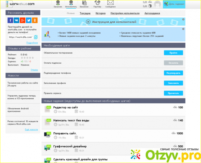 На главной страничке сайта просто завлекушка, что для заказчика (его заказ выполнят быстро и качественно), что для исполнителя (заказов неимоверное множество, никто обделённым не останется). Что ещё завлекает исполнителя, так это расценки. Цены очень и очень приличные, мне кажется, нигде таких расценок в Интернете больше нет. Регистрируемся. И что мы получаем? БОЛЬШОЙ СЮРПРИЗ! Очень даже неприятный. Необходимо пройти тесты, их три штуки. Эти тесты ничего особенного из себя не представляют, по моему мнению никаких профессиональных качеств исполнителя они не выявляют. Прошли тесты, отлично! Теперь Вас ждёт второй очень даже неожиданный сюрприз - прежде, чем Вы сможете начать зарабатывать на этом сайте, Вам необходимо ЗАПЛАТИТЬ! Заплатить за то, чтобы по итогу получить, а может даже и не получить желаемую работу. Как говорится, эту плату с Вас берут не просто так, а для того, чтобы Вы работали, а не просто так просиживали на этом сайте. Когда я регистрировалась, плата была 390 рублей, сейчас, может, другая сумма. Ещё один нюанс, с каждого Вашего заработка с Вас будет списываться процент в размере 10% в пользу ВОРКЗИЛЛЫ. Задания там очень и очень сложные, я бы даже сказала, что некоторые из них теоретически не выполнить за отведённое время, да ещё и за такую плату. То есть нужно сидеть за компьютером просто весь день, чтобы в итоге получить 150-300 рублей.
