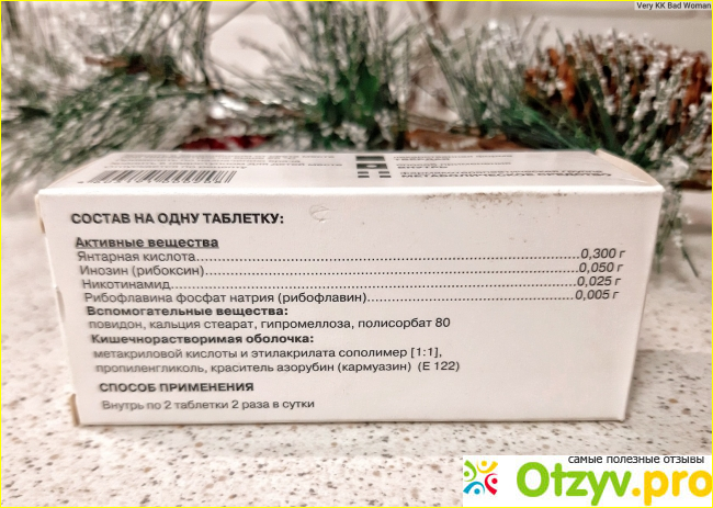 Препарат содержит четыре действующих вещества: янтарную кислоту, инозин, витамин РР, рибофлавин. также в качестве вспомогательных компонентов используются дополнительные химические элементы.