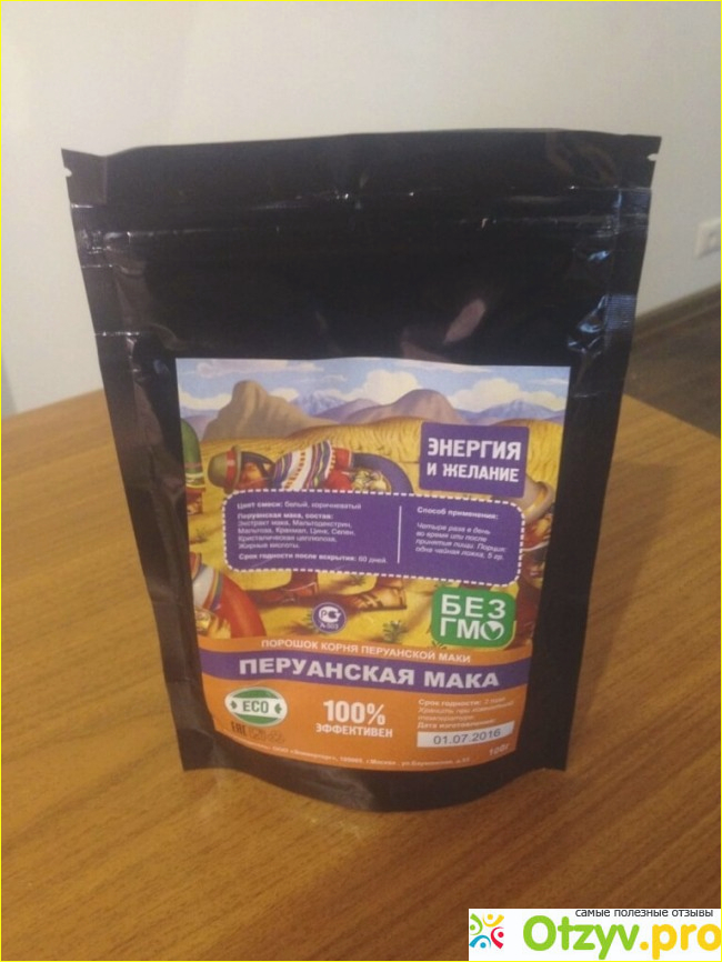 Пакетик с сухой травой Маки из Перу, который мы заказали через интернет, муж принимал в течении 2 недель. Купили второй пакетик, так как курс приема месяц.