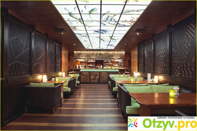 Интерьер в ресторане довольно неплохой, оригинально самобытный, но непродуманный и в какой-то мере хаотичный. Какого-то классического японского стиля здесь нет, с середины наполовину. Между столами кое-где установлены аквариумы, причём разной формы. Подсветка в аквариумах тоже разная, в одном вода зелёная, в другом какого-то черноболотного цвета. В одном аквариуме плавают большие зубастые рыбы, которые реально внушают страх. Если туда опустишь руку, то сразу могут и палец оттяпать, поскольку пасть у этих рыбин захватит сразу и кисть руки.