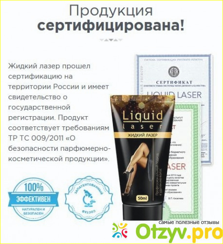 Средство имеет свидетельство о государственной регистрации, так как прошло сертификацию на территории России. Жидкий лазер соответствует требованиям безопасности парфюмерно-косметической продукции. О том, что продукт безопасен, говорит его сертификат безопасности, что не может не радовать девушек. решивших приобрести данное средство.