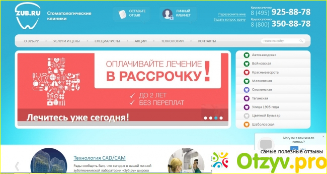 «Зуб. ру» мне очень нравится наличием официального сайта. Впрочем, сегодня все приличные заведения и учреждения его имеют. Однако сайт стоматологии «Зуб. ру» отличается своим удобством и лаконичностью изложенной информации. Если я хочу узнать цену на будущую услугу, просто захожу в раздел «Услуги и цены», где можно найти прайс, а также узнать, каким образом можно лечить зубы в кредит.