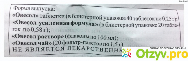 Овесол выпускается в нескольких формах. Это Таблетки, капли для приема внутрь и чай Овесол (фильтр-пакеты). Капли выпускаются объемами по 30, 50 и 100 миллилитров в упаковке. Таблетки курсом на 20 дней, то есть 40 штук. А еще есть Овесол Усиленная Формула - это 20 штук таблеток на курс 10 дней.