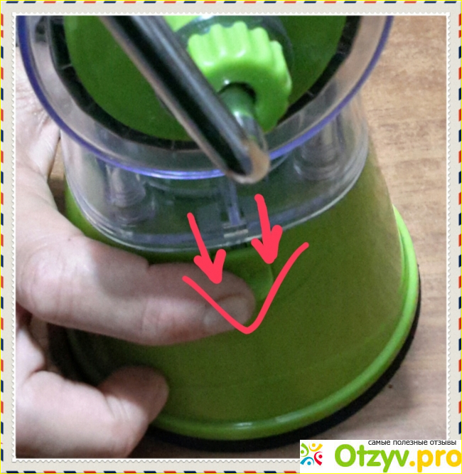 И проворачиваем верхнюю часть овощерезки, (из прозрачного пластика,) но уже против часовой стрелки и прибор моментально снимается со столешницы. Столу при этом никакого повреждения не наносится. А держится на столе овощерезка довольно плотненько.