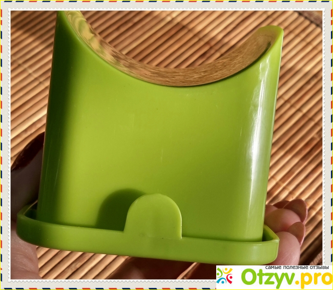 Основание, это пластиковый корпус, (он в салатовом цвете), который фиксируется на столешницу, (при фиксации получается вакуум), поворотом по часовой стрелке верхней части прибора, изготовленного из прозрачного пластика. Обратная сторона основание, это вот такая прорезиненная прокладка, которая и удерживает овощерезку на столешнице.