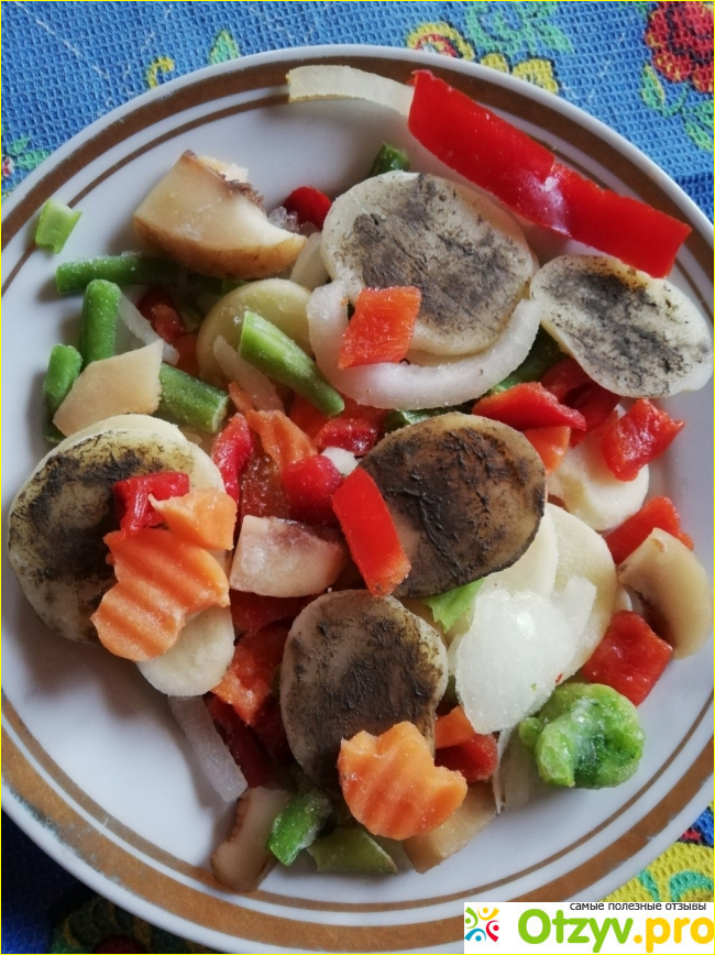 Внутри пачки я нашла хорошую, красивую и очень ароматную смесь. Продукт явно проходил быструю заморозку, т. к. ингредиенты легко отделялись друг от друга без предварительной разморозки. Рис белого цвета, овощи своих естественных оттенков. Сладкий перец нарезан мелкими кубиками, зато кусочки шампиньонов крупные. Не огромные, а просто крупные. Пропорции мне очень понравились. Все выглядело красиво, даже без готовки. Блюдо, которое получилось в итоге, не оставило меня равнодушной. Теперь я заказываю Мексиканскую смесь от бренда “4 сезона” достаточно часто. Можно сказать, что это стало моим дежурным блюдом, вкусным и очень полезным.