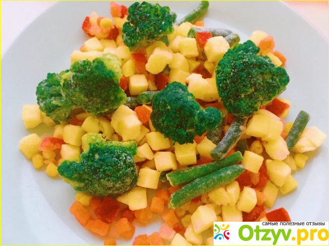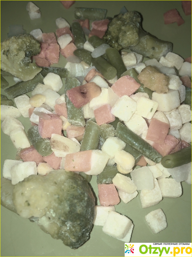 Вот такая смесь была в упаковке с белым медведем. Аккуратные соцветия яркого цвета, ровные кубики других овощей. Все ингредиенты чистые и качественные. Понравилось мне и то, что их состав сбалансированный. Все примерно в равных пропорциях.