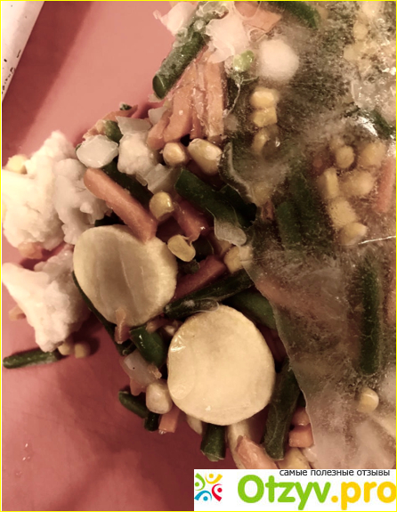Даже не знаю, стоит ли давать какие-то комментарии, по – моему, отношение к потребителю сразу видно. Откуда столько льда могло образоваться? Внутри пачки я увидела овощи, которые были нарезаны странным образом. Огромные и жирные в масле ломти картофеля, несколько штук на пачку. Буквально три огромных соцветия цветной капусты. Непомерно большие куски стручковой фасоли. Сладкий перец и морковь были нарезаны огромными брусочками. Зернышек кукурузы тоже очень мало. Хорошо если такого количество овощей хватит на 1 порцию человеку, чтобы наесться, не более того. Вид у этих овощей тоже странноватый. Как по мне, так они слишком бледные, даже для продукта, прошедшего заморозку, а уж тем более шоковую, как пишет производитель.