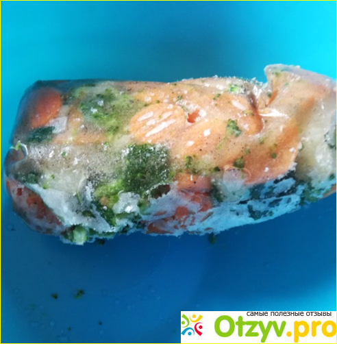 Внутри была ледяная глыба с кусками овощей внутри, но даже сквозь нее хорошо просматривалась грязь., которая находилась внутри и подгнившая цветная капуста.