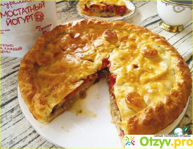 Разделить тесто на две части. Одну раскатать. Выложить на неё фарш, пилить йогуртом. Сверху выложить баклажаны, перец и помидоры. Посыпать сыром.
