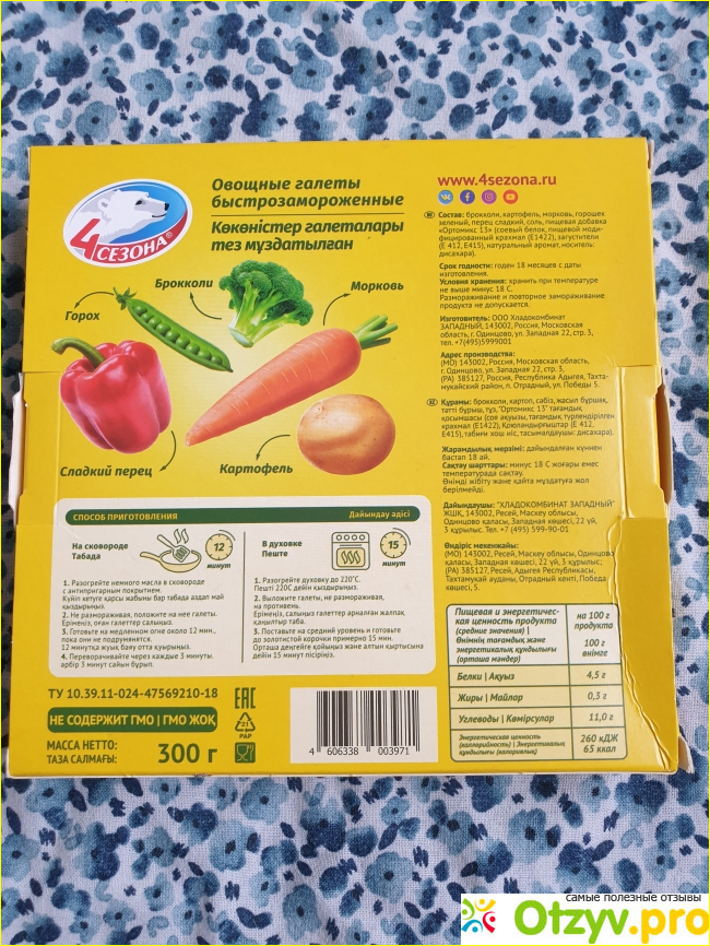 Овощные галеты по-деревенски от ТМ «4 сезона» — идеальное блюдо в пост, на диете, где есть ограничения на животные жиры, а также просто в качестве разгрузочного блюда. Эти котлеты выручают всегда, потому что готовятся они очень быстро, стоят недорого, к тому же это очень и очень вкусно. Упаковка выглядит очень презентабельно.