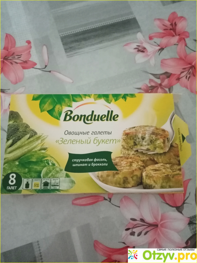 Буквально пару дней назад в сетевом магазине Пятёрочка рядом со знакомым продуктом я увидела овощные галеты Зелёный букет. У них оказался очень интересный состав:стручковая фасоль, капуста брокколи и шпинат. Наличие шпината в составе насторожило, так как мы его не очень любим, при этом понимаем огромную пользу для организма от этого зелёного продукта. Решила все таки взять на пробу и не прогадала, Зелёный букет нам понравились даже больше, чем Кантри. Внешне галеты друг от друга в целом не отличаются. Дизайн картонной упаковки абсолютно идентичен, а внутри неё восемь ровненьких зелёных шайбочек. Жарить на сковороде с добавлением растительного масла следует всего по паре минут с обеих сторон до образования хрустящей корочки. Кстати, лицевая сторона упаковки содержит рекомендации по приготовлению продукта.