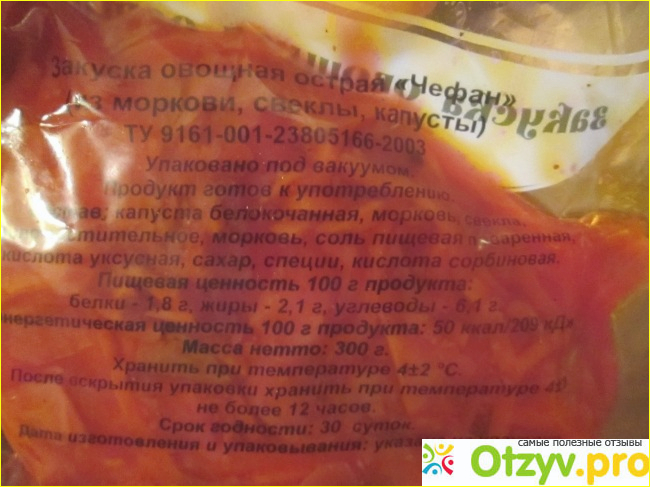 Так выглядит пакет с обратной стороны, сделано по ТУ, состав простой и понятный, срок годности невысокий, всего 1 месяц, а овощные консервы в банках могут храниться до двух лет.