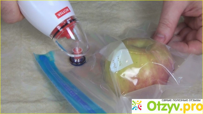 Работа устройства достаточно простая. Овощи или фрукты помещают в специальный контейнер или пакет, он плотно закрывается и при помощи упаковщика откачивается воздух через специальное отверстие, куда он прикладывается. Работа упаковщика производится от 6 батареек.