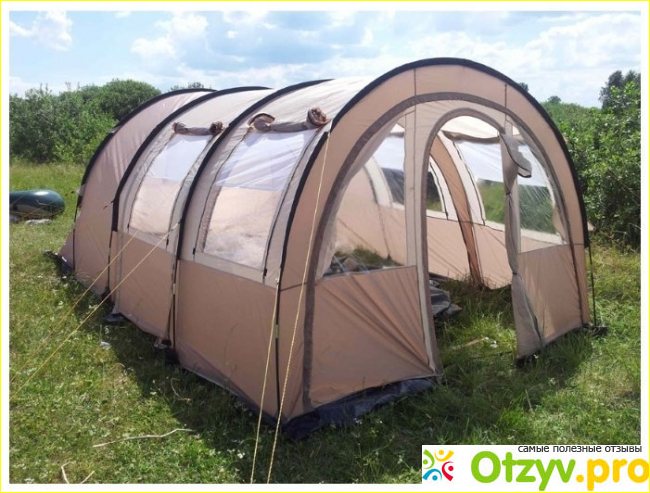 Изделие имеет форму полубочки, за счет это у нее внутри получается большое количество свободного пространства. При выборе палатки всегда нужно обращать внимание на количество ее слоев и качество материала. Эта модель является двухслойной. Сам материал у нее конечно идет полиэстер. Но он тоже бывает разного качество. Здесь сама ткань достаточно плотная и имеет специальную пропитку PU. Такая пропитка отлично защищает ткань от дождя и любой другой непогоды. Палатка вообще не пропускает любую влагу и внутри нее всегда сухо, уютно и комфортно.
