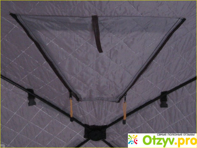 Есть и петли для дополнительной фиксации на оттяжку. Так что эта палатка хорошо выдержит даже сильный порыв ветра, если всё правильно и надёжно закрепить. Она состоит из трёх слоёв утеплителя, а вход в неё надёжно закрывается застёжкой на молнии с защитным клапаном. Внешний слой палатки покрыт водоотталкивающим составом. Внутри поверхность мягкая и специально сделана светлой, чтобы хорошо отражать внутри свет. Есть довольно крупные окна с фиксацией на липучке. В плохую погоду они застегиваются с помощью молнии. Для вентиляции, как я уже написала, имеется два специальных отверстия сверху и снизу, которые помогают циркулировать воздуху. Так что вы в ней не задохнётесь, даже если закупорите окна и двери на молнии. Очень удобно то, что внутри по стенкам есть специальные фиксаторы, которые позволяют повесить не тяжелые предметы или одежду. Вверху имеется даже небольшая полочка под самой крышей. В целом получается очень просторное помещение с высотой чуть более двух метров. Со сборкой справиться любой мужчина за пол часа. Справиться и женщина, только затратит на это дело дольше времени. Но определенная сноровка и опыт для этого дела всё-таки нужны. После каждого летнего сезона отец всегда чистит внутреннюю и внешнюю поверхность палатки у нас на даче. Эту же процедуру повторяет и после холодного периода. Так что выглядит палатка почти каждый раз, как новенькая. Он у нас вообще человек очень бережливый к вещам и заботиться о них очень бережно и трепетно. Сказывается, что когда-то в роду у нас были немцы, видать этот педантизм и любовь к порядку достались ему от них.