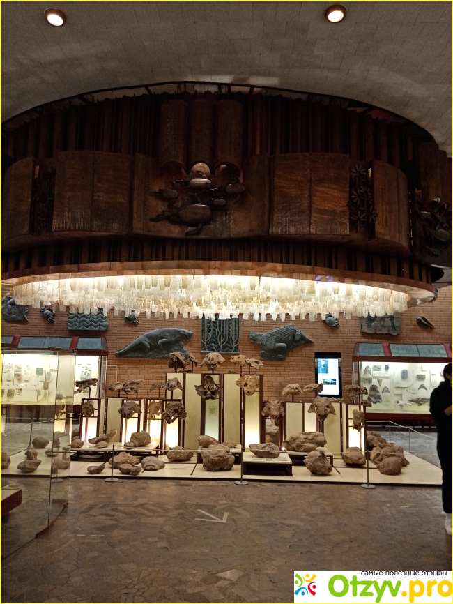 С начало идет зал в водном характере, здесь представлено керамическое Древо жизни, оно, очень огромное, и здесь изображены животные почти с натуральную величину. Все это мы видим на первом этаже, потом поднимаемся на второй этаж. Огромные мраморные лестницы, высота потолков, меня поразила площадь музея. В центре зала находится скелет мамонта, а при выходе слепок скелета гигантского носорога.