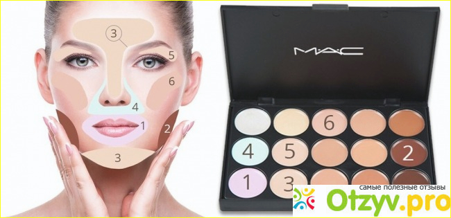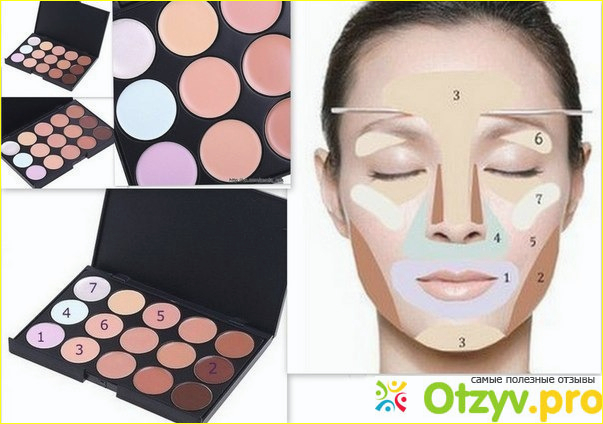 Консилер может продаваться в одном цвете, в двух, но самые лучшие варианты те, которые продаются в палетках. Такие же консилеры, предназначены именно для полного корректирования лица. Обычно в палетку с этим средством входит не менее 6 оттенков, самый идеальный вариант, палетка с 12 оттенками. Каждый цвет отвечает за определенную часть лица. Например самые темные оттенки предназначены для уменьшения носа и затемнения скул, для уменьшения лба. Более светлые оттенки используются как высветляющие цвета для глаз, области под глазами, под бровями, на лбу. Оттенки с блестками, используются для блеска как хайлайтер. Зеленые оттенки скрывают красные пятна, угри. Розовые оттенки скрывают синяки под глазами. Каждый оттенок по своему важен и отвечает за свою определенную функцию. Что бы убедиться в этом собственными глазами, предлагаем рассмотреть следующие фото.